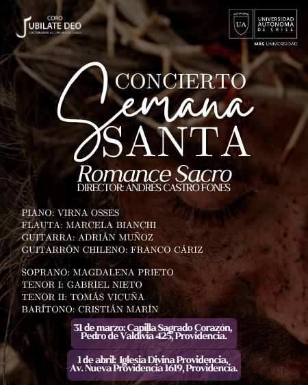 El Coro Jubilate Deo, fundado en 1988 y establecido como agrupación estable de la Universidad Autónoma de Chile, es reconocido por su calidad interpretativa y su compromiso con el repertorio coral diverso, incluyendo música sacra, popular chilena y obras contemporáneas. Bajo la batuta de Andrés Castro Fones —profesor de música, licenciado en educación y con amplia trayectoria como director y compositor—, el ensemble ofrece una propuesta artística que une excelencia musical con profundo sentido devocional.